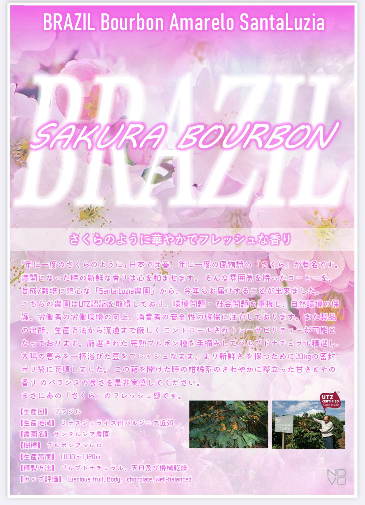 「年に一度のさくらのように」日本では春、年に一度の風物詩の「さくら」が有名です。満開になった時の新鮮な香りは心を和ませます。そんな雰囲気を持ったコーヒーを、育成/栽培に熱心な「Santa Luzia農園」から、今年もお届けすることが出来ました。こちらの農園はUTZ認証を取得しており、環境問題・社会問題を重視し、自然環境の保護、労働者の労働環境の向上、消費者の安全性の確保に注力しております。また製品の出所、生産方法から流通まで厳しくコントロールされトレーサビリティーが可能となっております。厳選された完熟ブルボン種を手摘みしてパルプドナチュラル精選し、太陽の恵みを一杯浴びた豆をフレッシュなまま、より新鮮さを保つために20kgの密封ポリ袋に充填しました。この箱を開けた時の柑橘系のさわやかに際立った甘さとその香りのバランスの良さを是非実感してください。まさにあの「さくら」のフレッシュ感です。